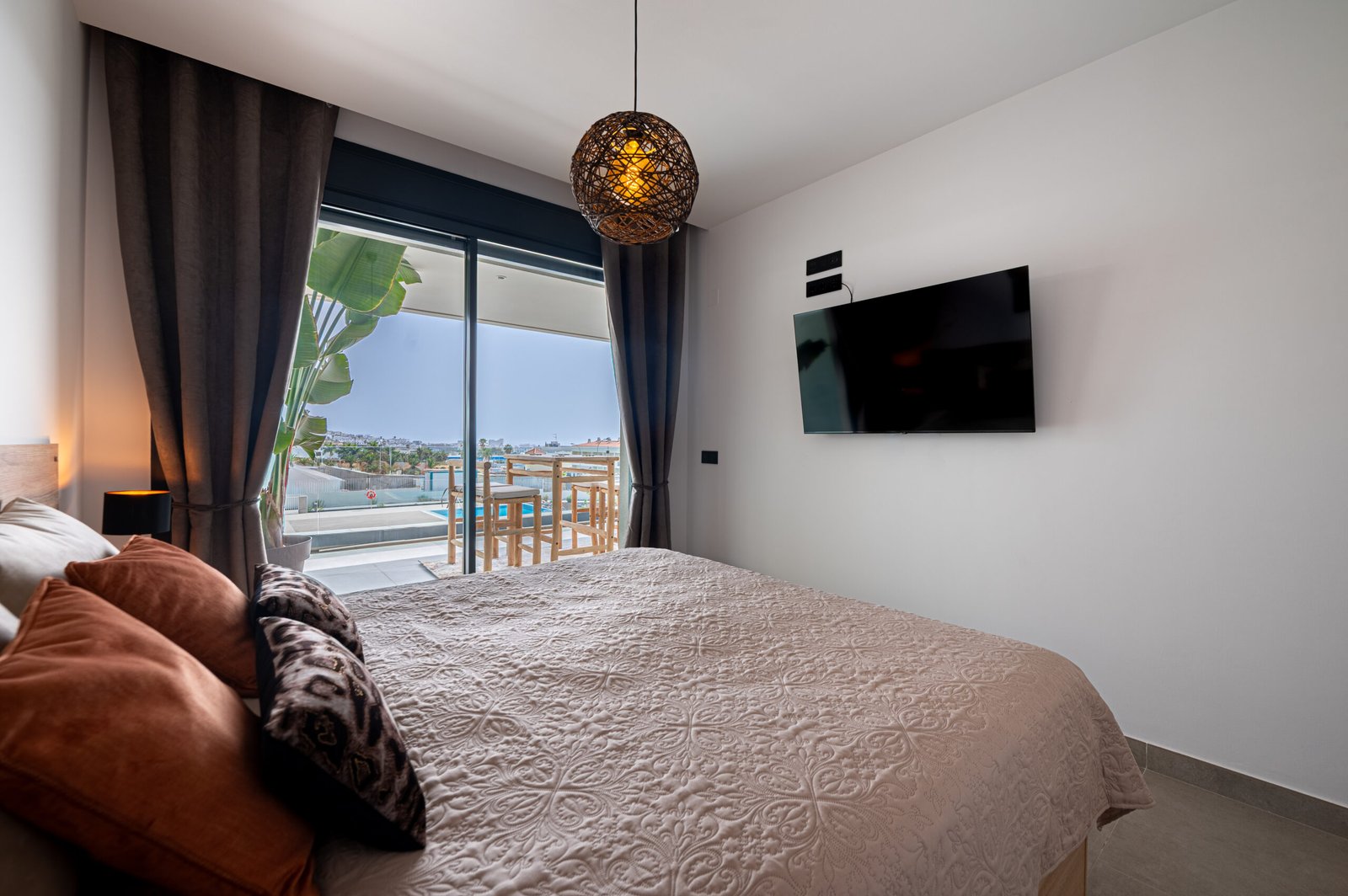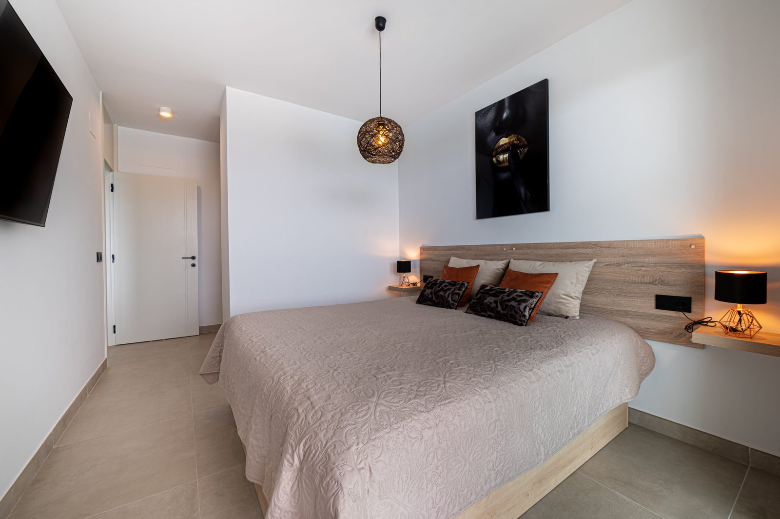 The apartment offers three comfortable bedrooms, each with built-in wardrobes. The master bedroom features a king-size bed and its own en-suite bathroom. The two additional bedrooms are furnished with queen-size beds and share a stylish modern bathroom. For added comfort, every bedroom has its own air-conditioning unit and flat-screen TV.