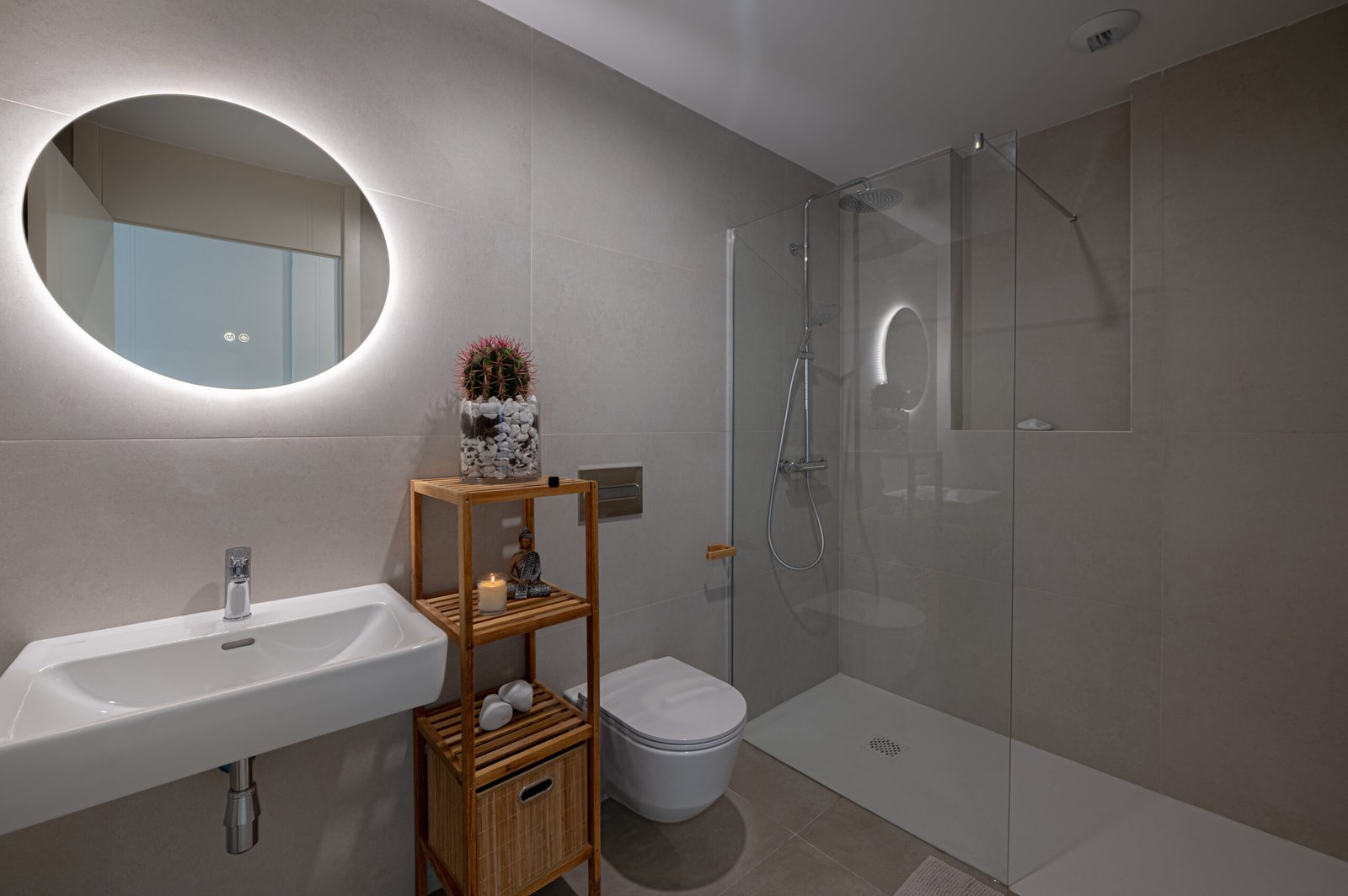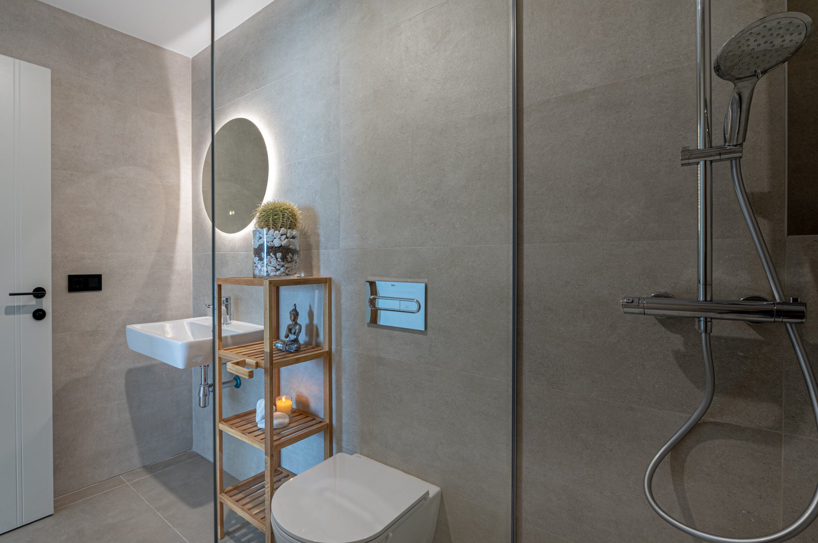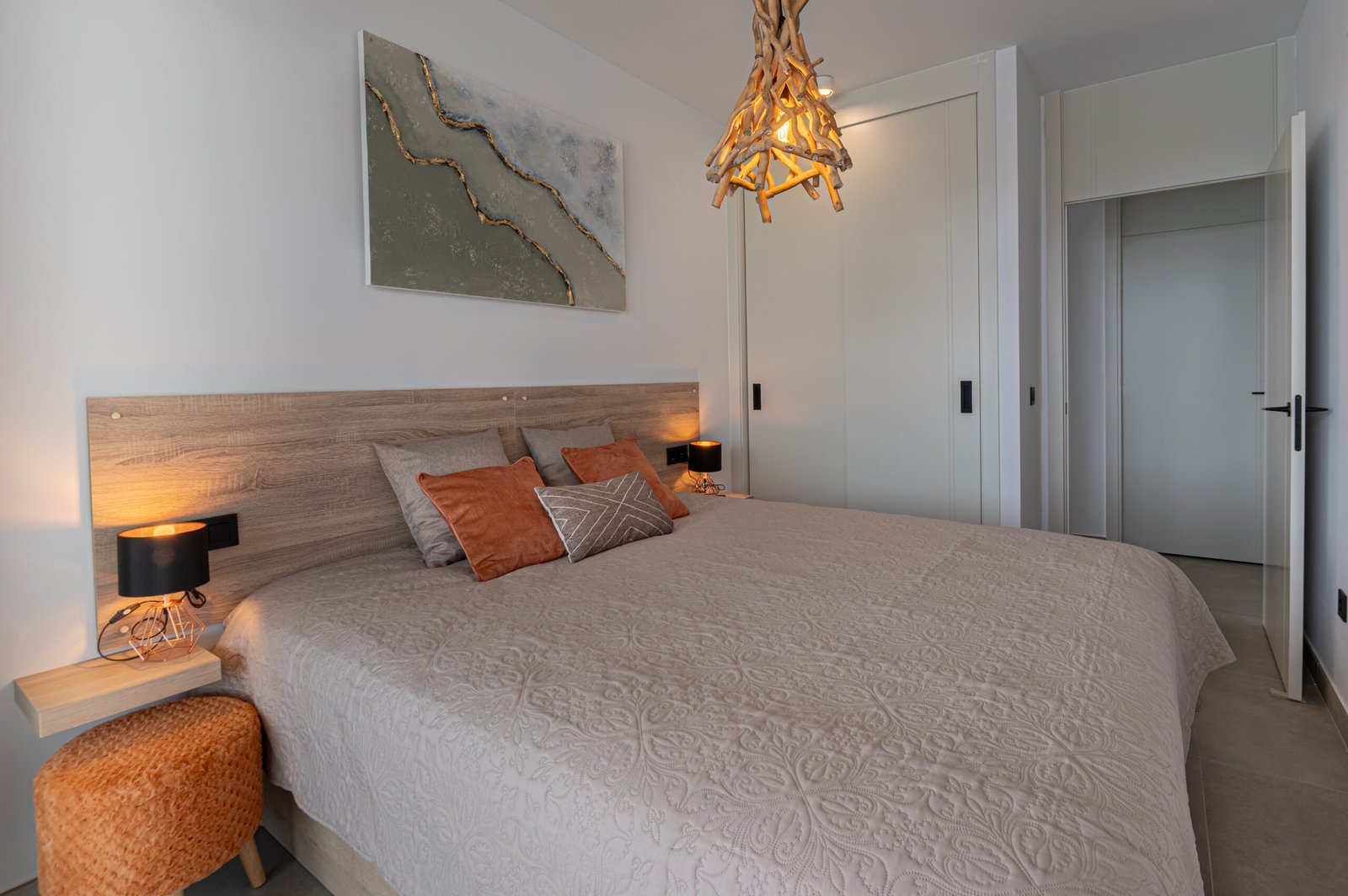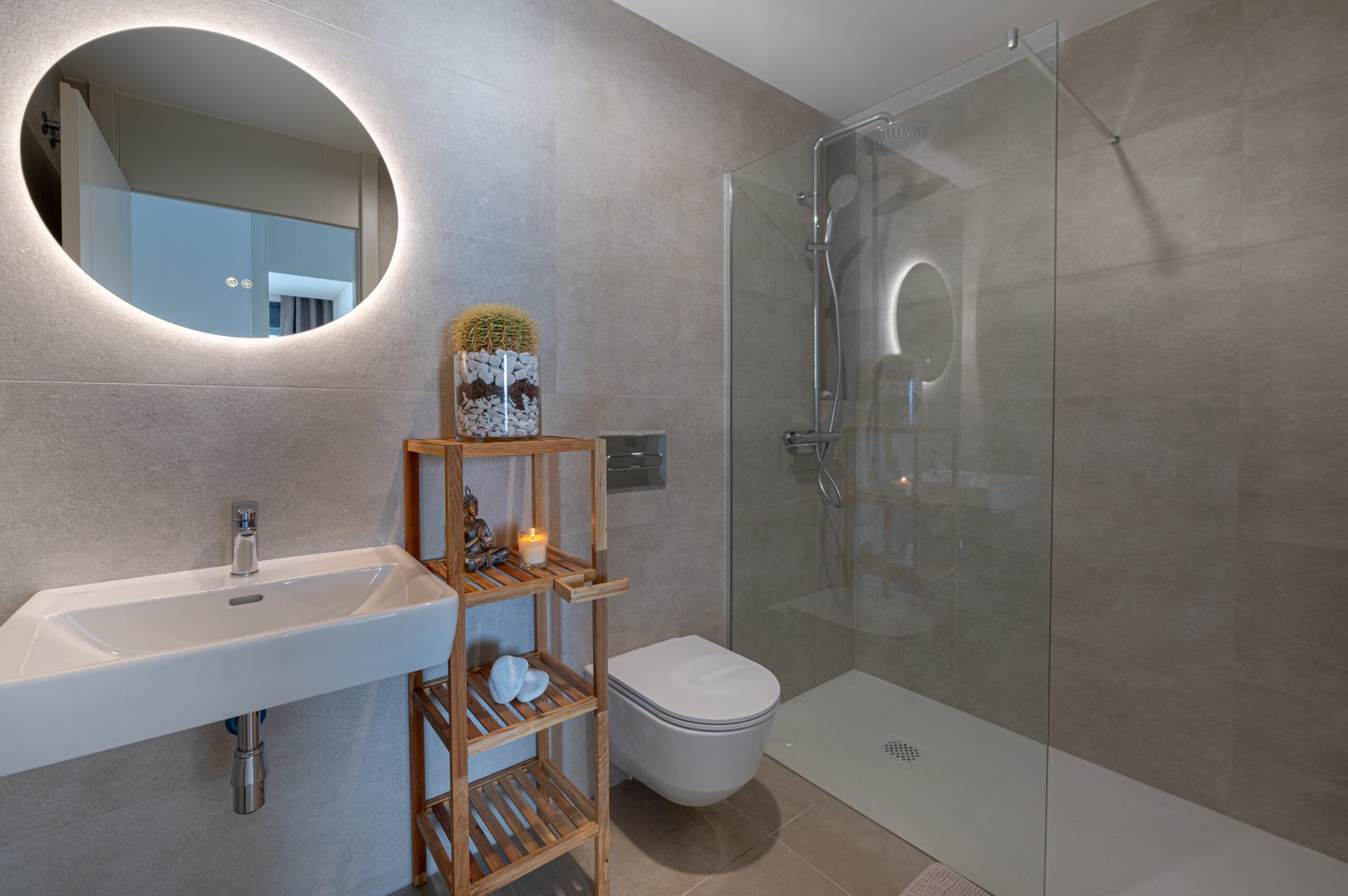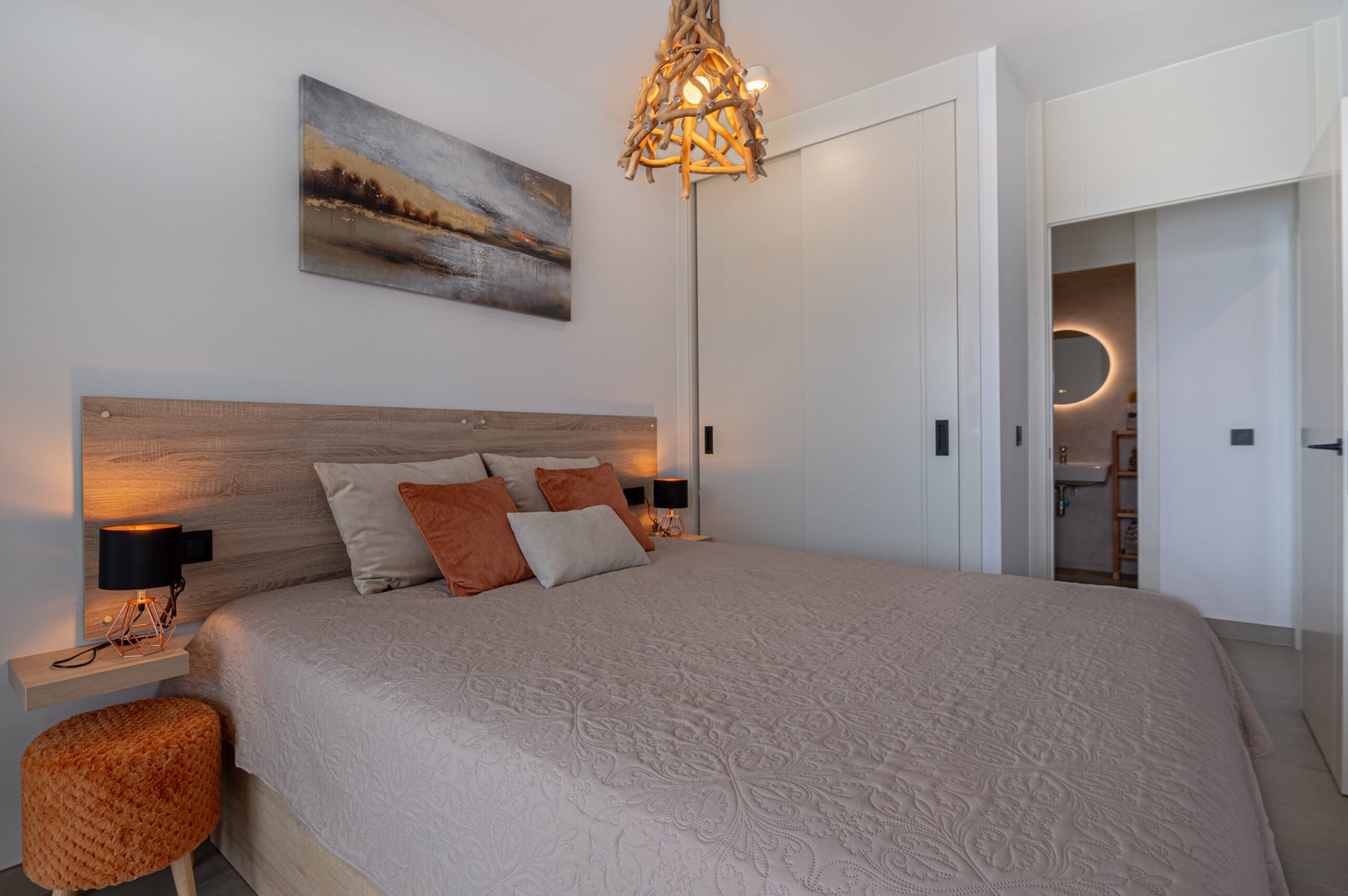 The open-plan living area feels airy and welcoming, with plenty of natural light throughout. The modern kitchen is fully equipped, making it easy to prepare anything from light snacks to relaxed family meals. Outside, the private terrace offers a wonderful space for slow breakfasts, afternoon relaxation, or drinks while watching the evening sky.
