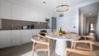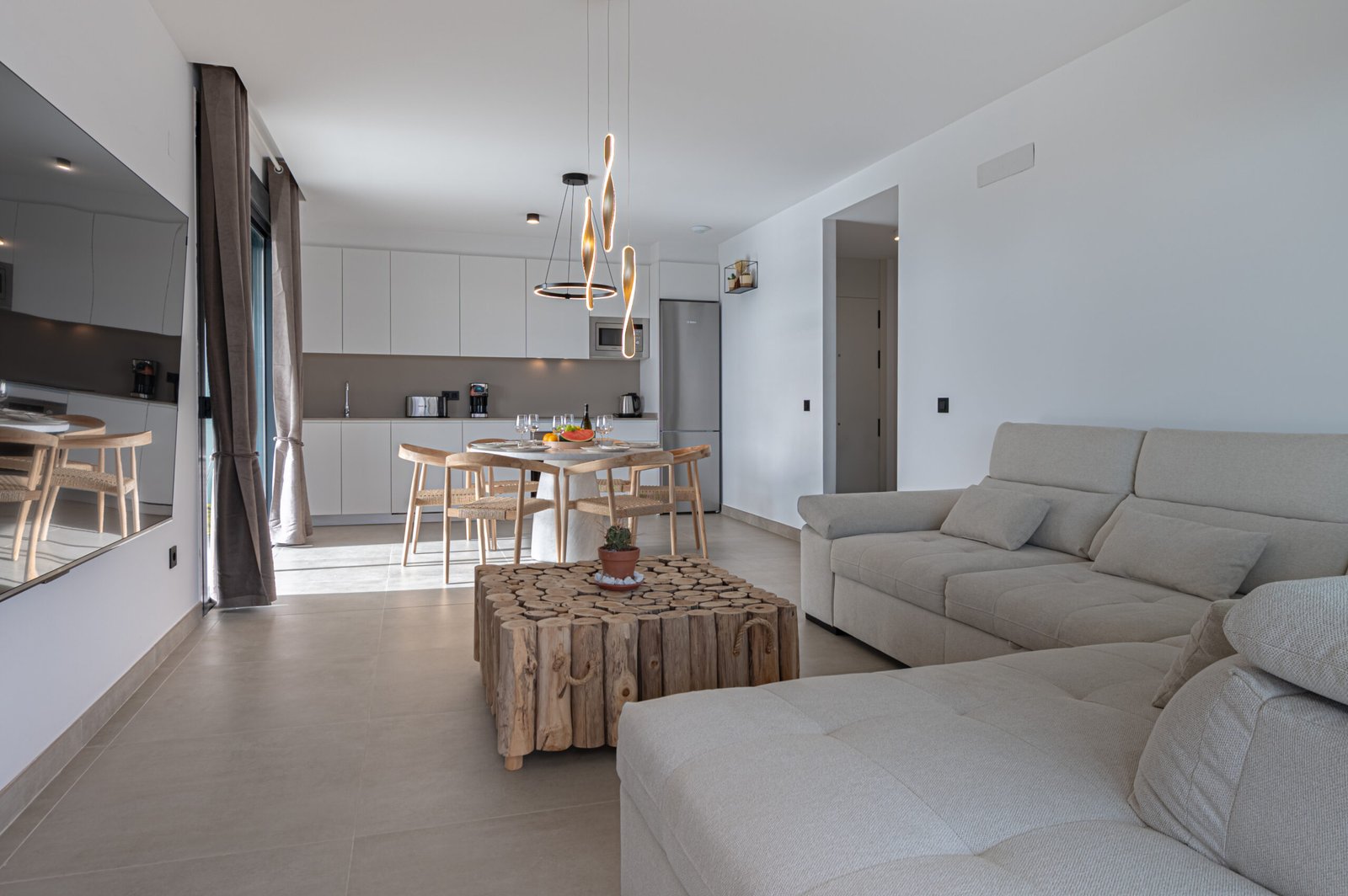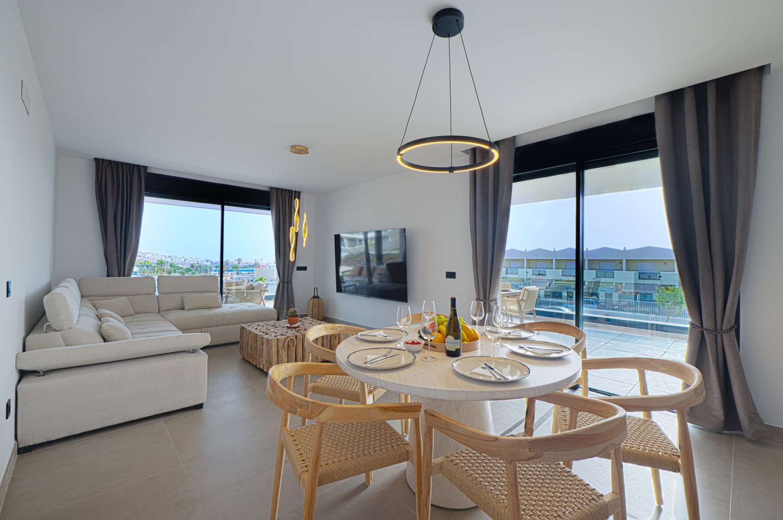 The bright open-plan lounge and dining space opens directly onto the terrace through large sliding doors, creating a seamless indoor–outdoor feel. The kitchen is fully fitted with modern appliances, including a dishwasher and washing machine, making it ideal for both short visits and longer stays. High-speed Wi-Fi and a flat-screen TV are also available.
