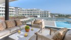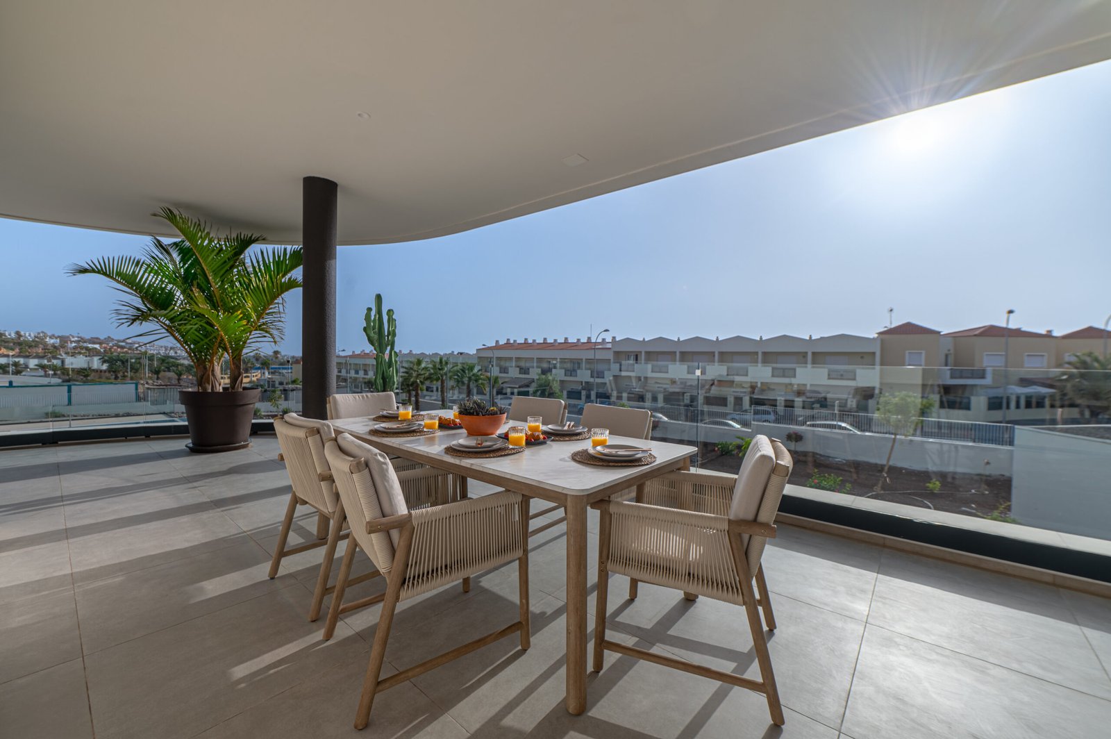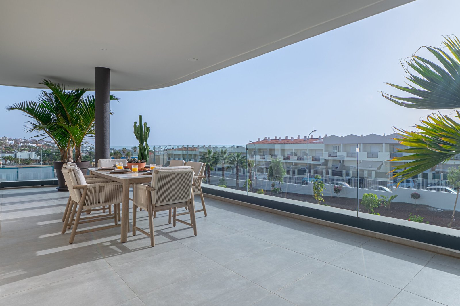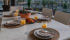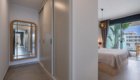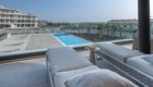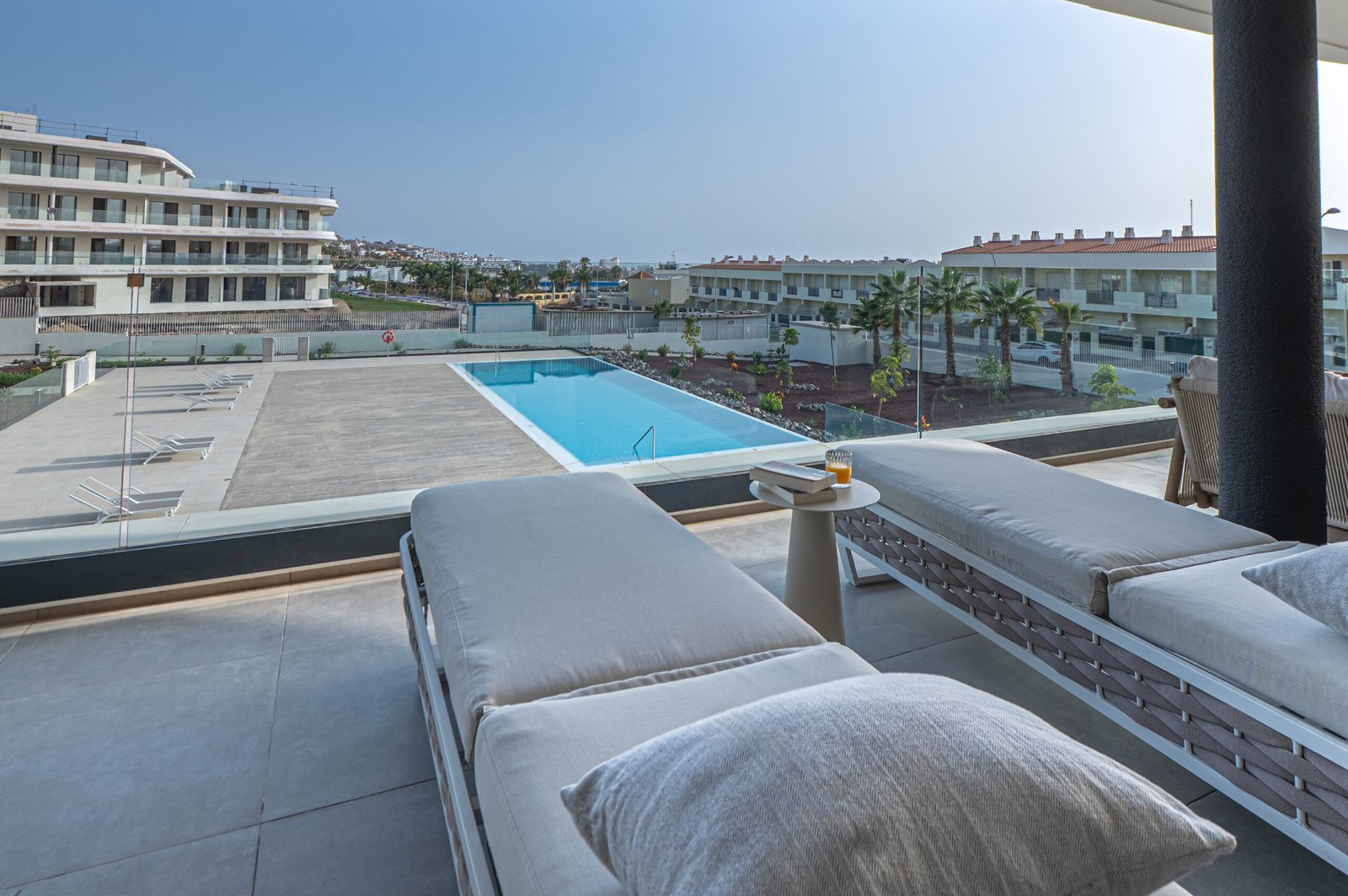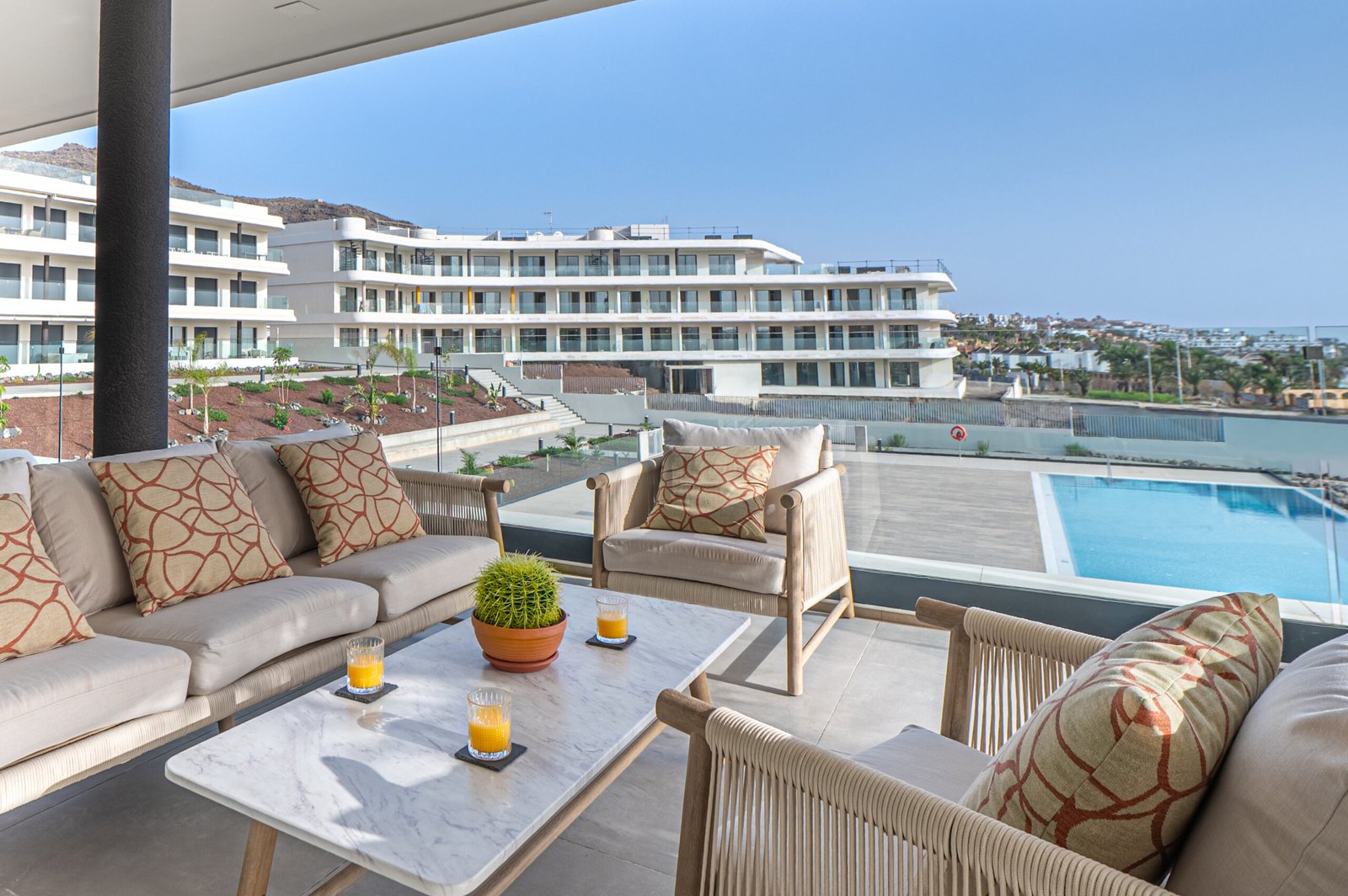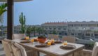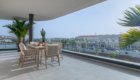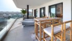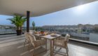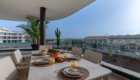 The private terrace extends around the south and west sides of the apartment, offering lovely views over the landscaped gardens and the heated communal pool. The south-facing section overlooks the pool and enjoys sunshine from midday until evening, while the west-facing side provides a perfect spot to unwind and watch the sunset. Electric awnings are available to provide shade whenever needed.